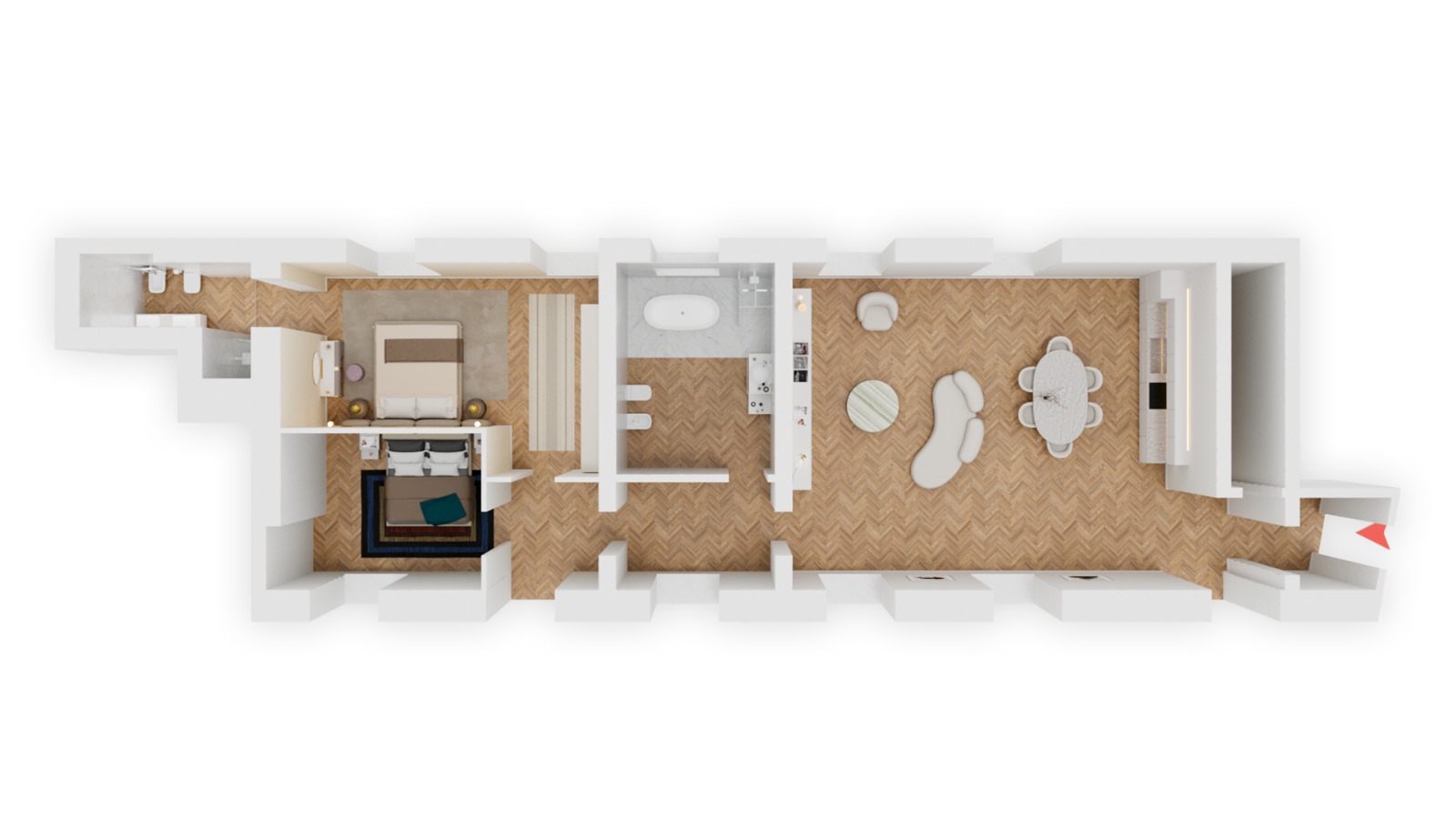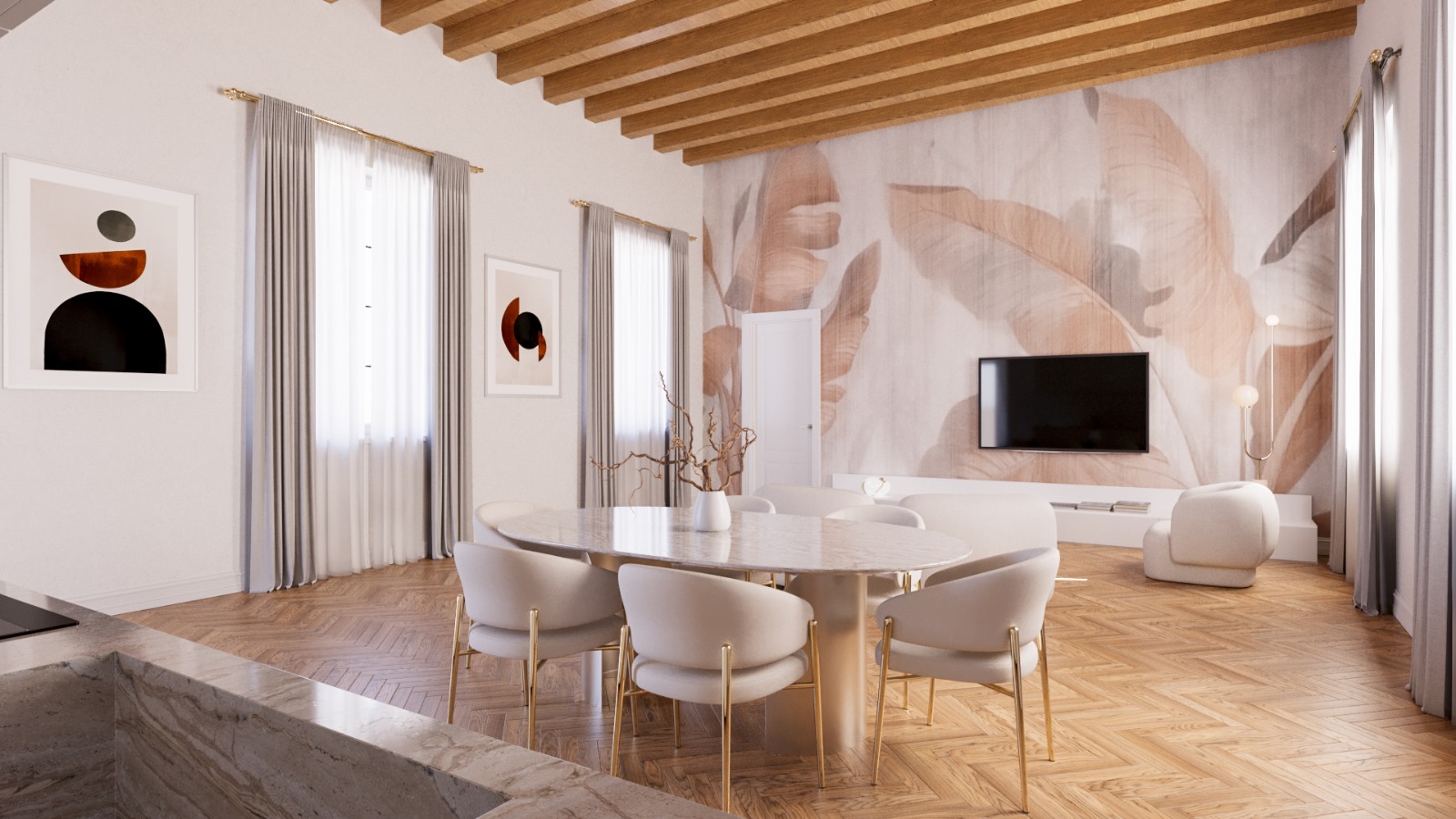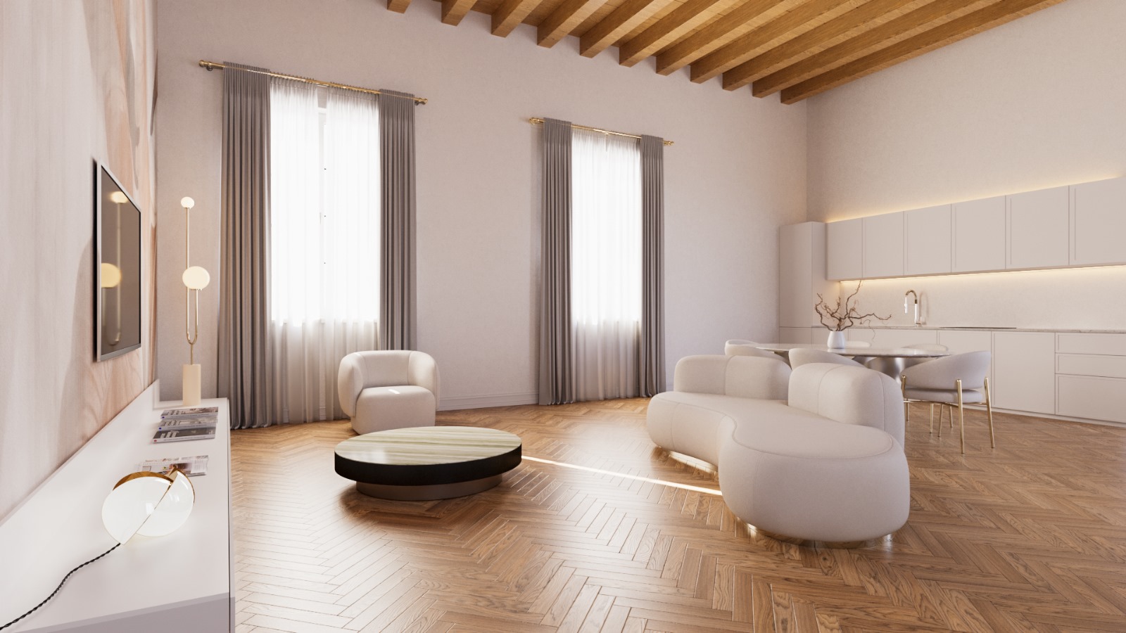 Il risultato è un appartamento che racconta il perfetto equilibrio tra tradizione e innovazione: soffitti con travi originali restaurate, pareti riportate alla luce, nuovi impianti integrati con discrezione e dettagli moderni che dialogano armoniosamente con l’antico.